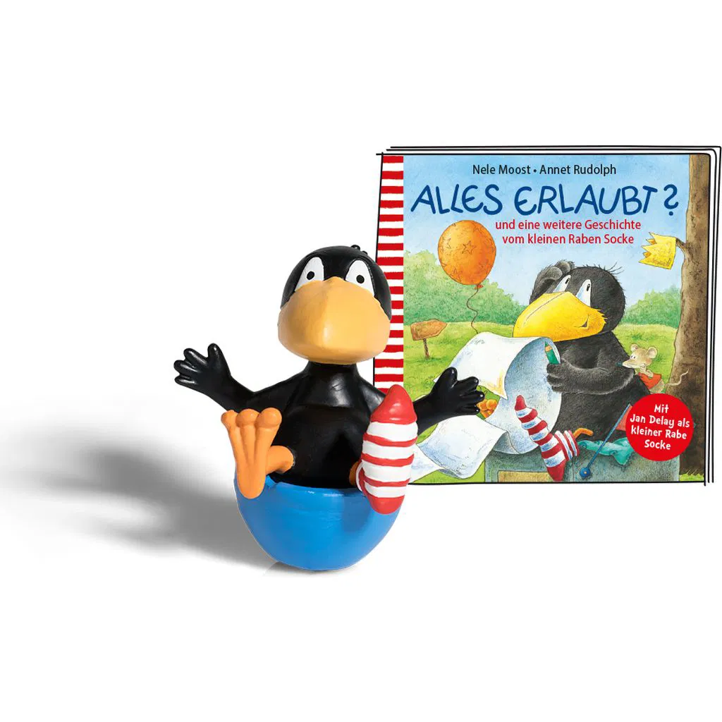 Der kleine Rabe Socke ist eine Kinderbuchreihe, die auch als Trickfilmreihe für die Kinderfernsehsendung Unser Sandmännchen produziert wurde. Darüber hinaus gibt es drei Kinofilme mit und um den kleinen Rabe Socke. Die Hörfiguren des kleinen Rabe Socke entstand nach der Vorlage der Zeichnungen der Illustratorin Annet Rudolph. Die Texte, die mit der Hilfe der Hörfigur und der Toniebox abgespielt werden können, stammen von Nele Moost. Abgespielt wird über die Magnethaftung der Hörfigur auf der Toniebox die Geschichten Der kleine Rabe Socke – Alles erlaubt? oder Der kleine Rabe Socke – Alles vermurkst oder Der kleine Rabe Socke – Alles Schule!, die eine Abspielzeit von ca. 40 Minuten (je nach Hörfigur) haben. Die Handhabe der Toniebox ist sehr einfach. Wird die Hörfigur heruntergenommen, wird das Hörspiel unterbrochen. Beim Wiederaufsetzen der Hörfigur geht das Hörspiel weiter.